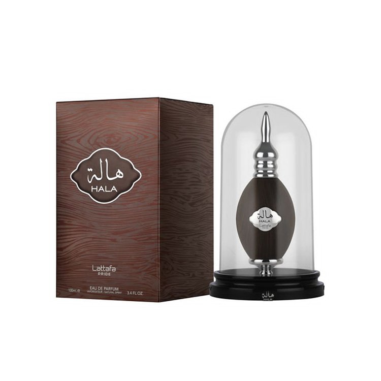 Hala by Lattafa Pride is a luxurious, woody-spicy Eau de Parfum presented in an elegant, capsule‑shaped bottle housed in a sleek glass dome. Inspired by refined craftsmanship, this 100 ml fragrance offers a sophisticated scent experience perfect for everyday luxury or special occasions. The packaging features a rich wood‑grain box with Arabic and English branding, highlighting the artisanal pride of Lattafa perfumes.